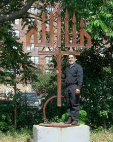This sculpture shows the relationship of the three major religions Judaism, Christianity and Islam with the sun as a natural source of light. The Star of David holds it all together.
