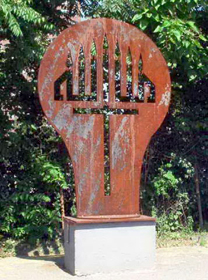 This sculpture is the relationship between the three major religions, Judaism, Christianity and Islam, within a light bulb, to produce light. The three religions are represented as a menorah, a cross, and Allah written in Arabic.